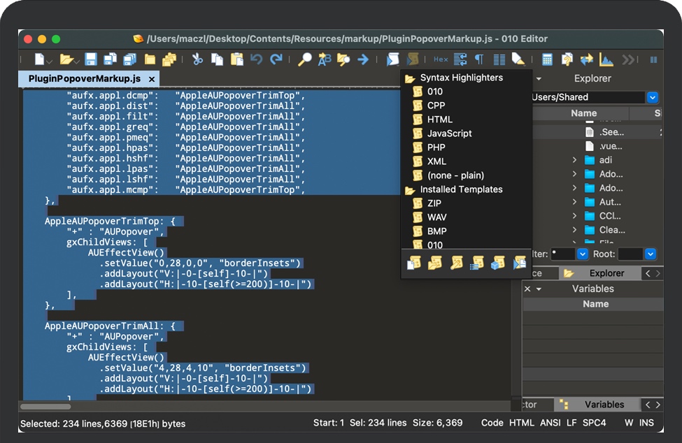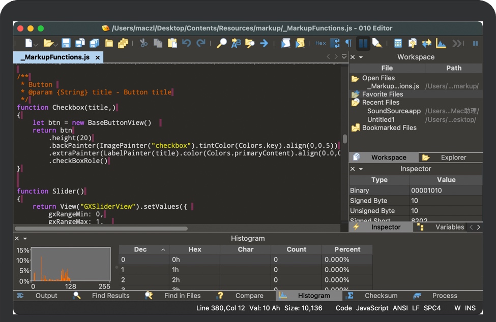 010 Editor for Mac 旨在成为能够编辑和解析任何二进制文件的专业文本编辑器和十六进制编辑器。文件在中央区域显示为一系列文本字符或十六进制字节。010 Editor 最强大的功能是能够将二进制文件解析为可以理解的数据结构。解析由二进制模板完成,显示在右上角,运行模板的结果显示在十六进制编辑器下方的模板结果面板中。
