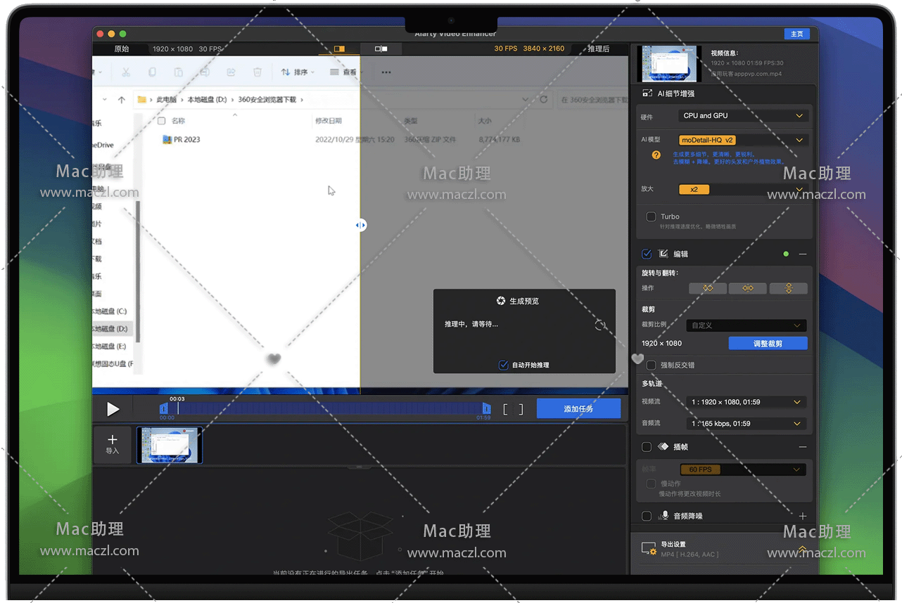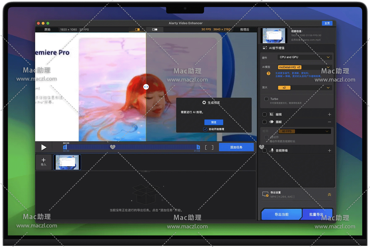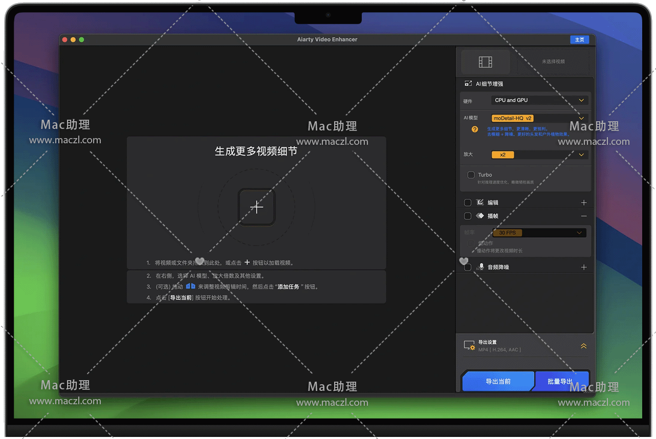 Aiarty Video Enhancer for Mac 是一款基于人工智能技术的桌面端视频增强软件,致力于通过先进的 AI 模型提升视频质量,为内容创作者和视频爱好者提供专业级的视频优化解决方案。Aiarty Video Enhancer能够生成更多细节、强效降噪、消除模糊、提升分辨率,并将有瑕疵的视频修复至 4K 清晰度。凭借专业的 AI 模型,它能以极速提供卓越的视觉质量,为内容创作者和视频爱好者赋能。