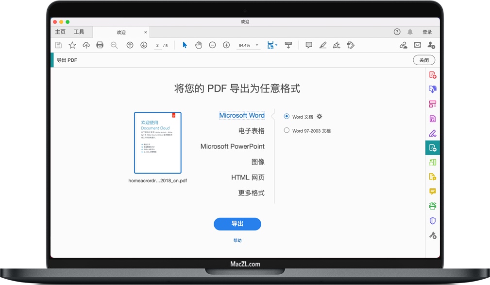 将选定的部分文件导出为 Microsoft PowerPoint 格式 (Acrobat Pro)、Word、Excel 或 HTML。