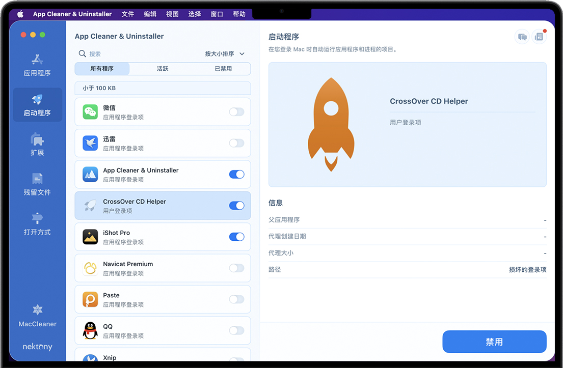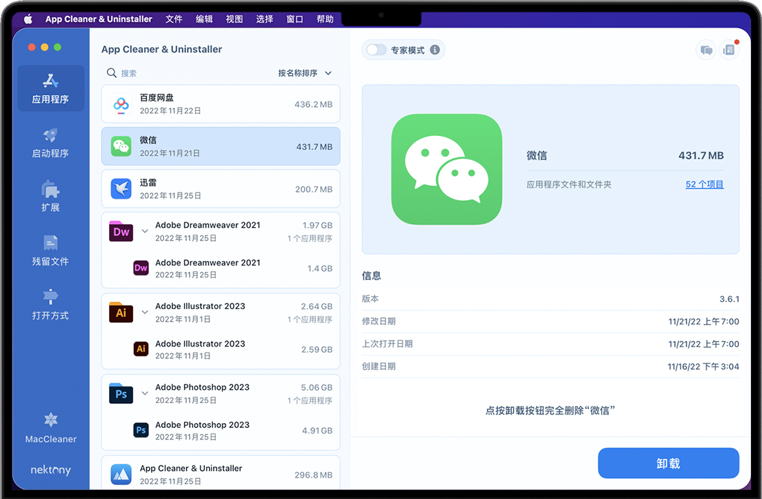 App Cleaner & Uninstaller for Mac 是一款简单易用的macOS软件卸载应用程序。这个轻量级应用程序在清除应用程序卸载时留下的链接、文件和其他垃圾方面做得很好。顾名思义,它还允许您从一开始就干净地卸载应用程序,并设置启动时启动的应用程序。删除Mac上的软件不仅仅是将应用程序拖到垃圾箱。如果你想从Mac上完全删除应用程序及其所有偏好、缓存和其他部分。卸载Mac软件的不二选择,强烈推荐各位新老用户下载安装,App Cleaner & Uninstaller 8在Mac助理网站免费提供后续的更新升级下载。