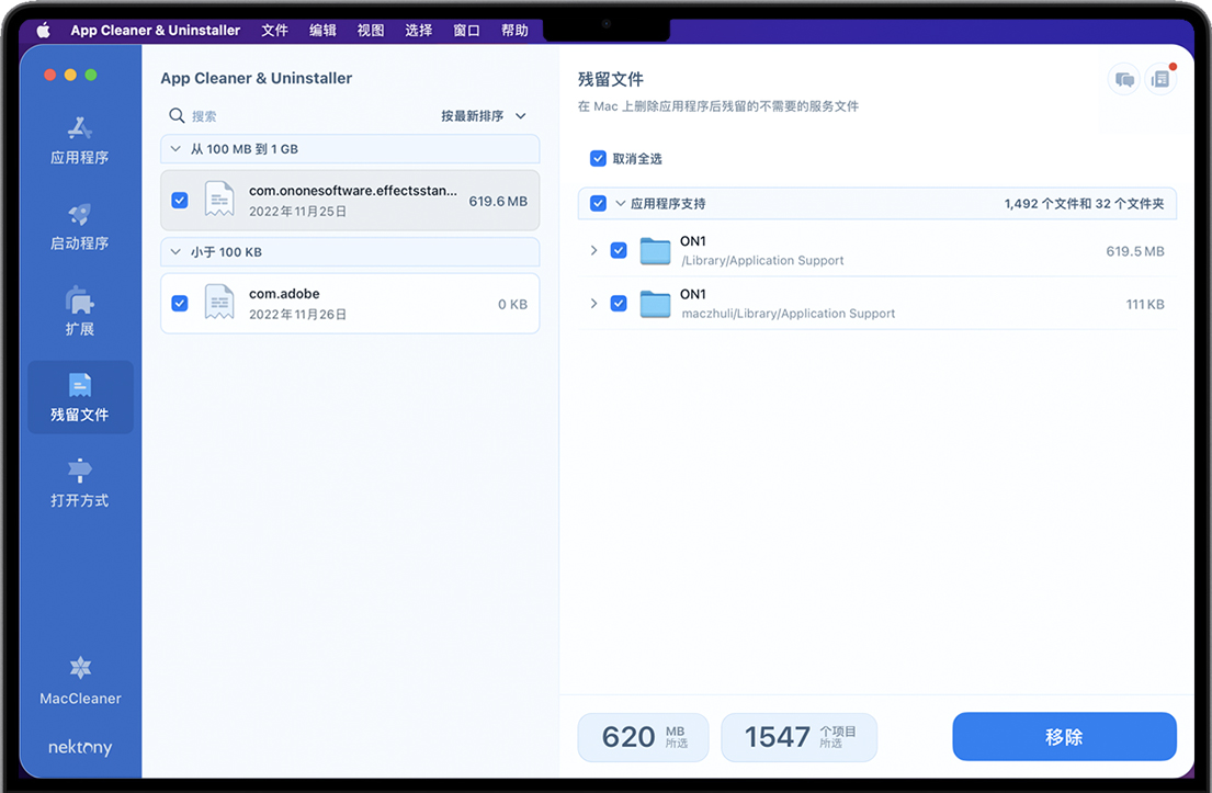| 删除软件只需单击Mac | 删除应用程序的服务文件夹 | 移除残留物已删除应用的数量 |