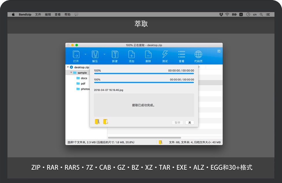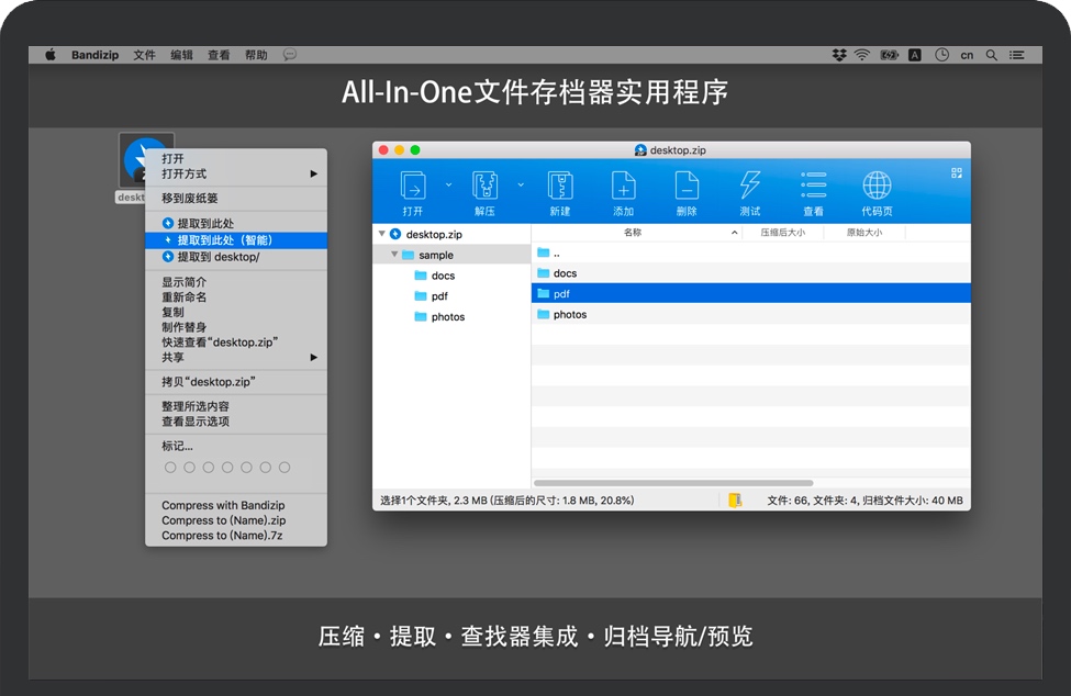 Bandizip for Mac 是一款轻量级、快速且整合程度较高的解压缩软件!因其功能强大界面简洁无广告。最大的亮点是集成到Mac资源管理器的右键菜单,界面纯净。Bandzip for Mac具备非常快速的压缩与解压缩算法,支持鼠标拖拽操作以及多线程操作。