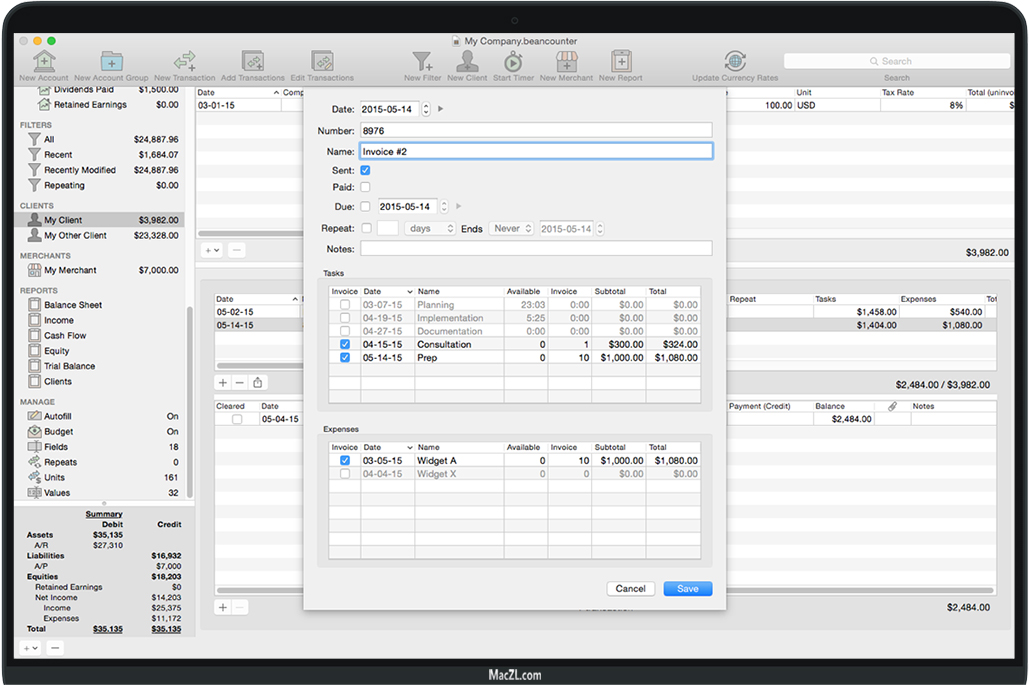 添加新的交易,支持九种类型的自定义字段和文件附件。将照片、扫描件、语音备忘录和文件(如收据、发票和其他文件)附在每笔交易上。定义自定义会计期间并自动清除名义账户。BeanCounter支持预算、过滤器、批量交易编辑、自动填表和分割/重复交易。将交易导入和导出为各种文件格式。 跟踪客户的项目任务和支出。任务可以是定时的(使用附带的时间跟踪器)或不定时的。生成定制的估算和发票,逐项列出任务和费用。从五种发票布局中选择,或设计你自己的自定义布局。追踪未付的发票余额并管理收到的付款。 一般