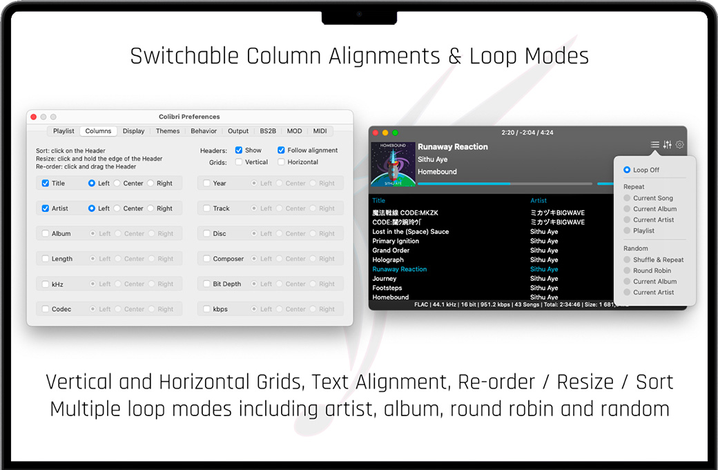 能够按照预期显示的方式呈现歌曲信息:在所有尝试过的元数据中,它在显示西里尔字母或汉字/片假名/平假名字符与 ASCII 混合时没有问题。Colibri 支持 BASS 引擎和 macOS 可读的所有已知元数据类型。