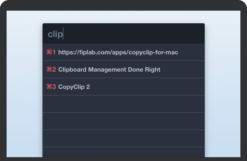 CopyClip for Mac 是一款Mac剪贴板历史管理器。您可以方便的通过菜单栏使用它,CopyClip存储您复制过或剪切过的所有内容,使可以通过 CopyClip 快速的查看复制剪切历史并重用它们。CopyClip 2是Mac上最流畅,最高效的高级剪贴板管理器。从菜单栏中谨慎运行,该应用程序会存储您过去复制或剪切的所有文本,从而使您可以快速找到所需的文本片段。