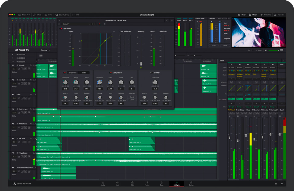 Fairlight是一款成熟的数字音频工作站,具有高性能多音轨样本级编辑和混音功能!您可以获得ADR工具、对声音库的支持、用于快速同步声音的音频和视频滚动器、滚动时间表、标准化和Fairlight FX插件,包括hum remover、de esser、reverb等。DaVinci Resolve Studio还支持生成和编辑Dolby Atmos home软件包!