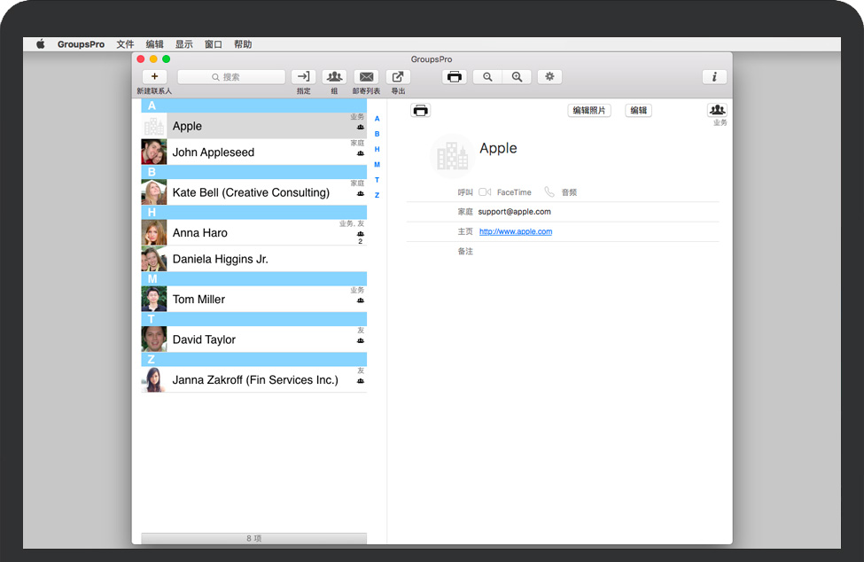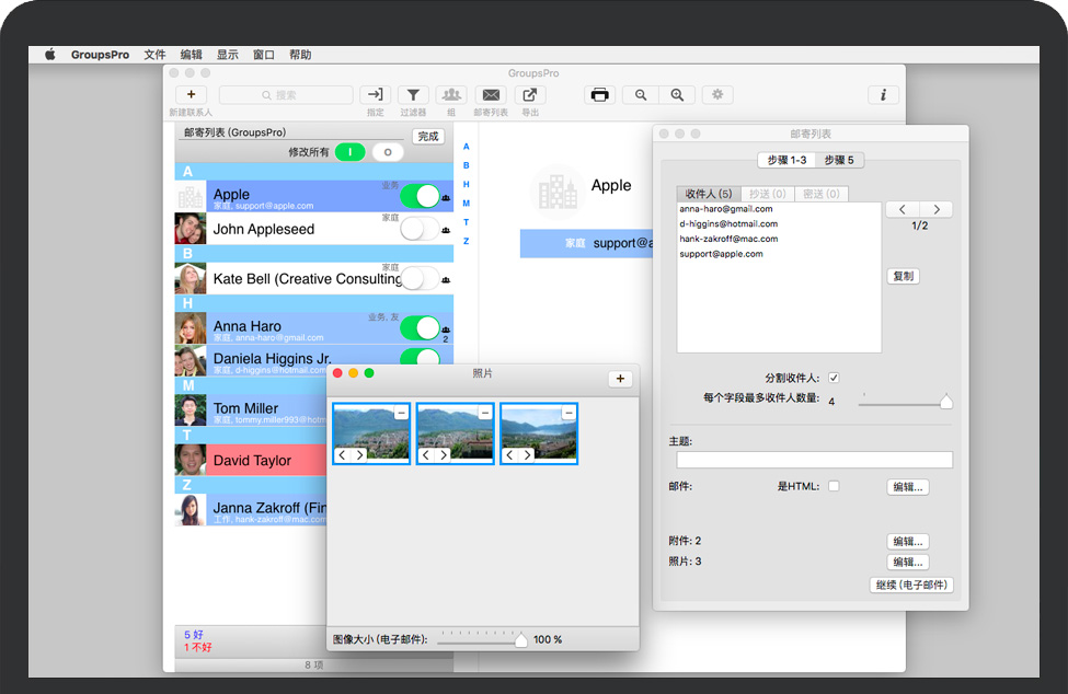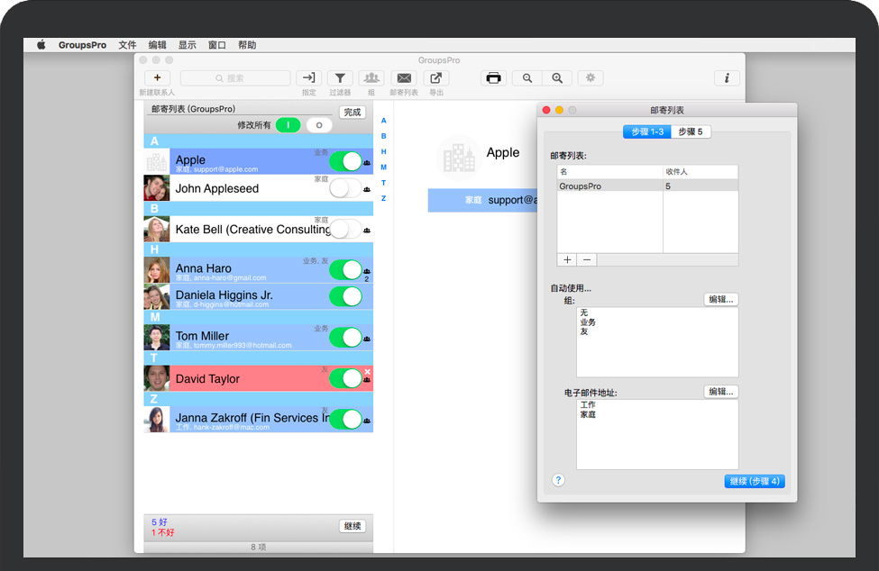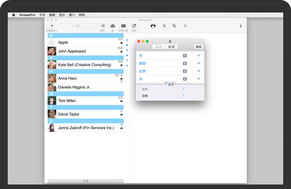 GroupsPro for Mac 是创建和组织联系人组以及为大量SMS和电子邮件创建邮件列表的绝佳方式,邮件列表包含组成员或单个收件人。GroupsPro服务产生和组织联系人群组并产生邮件邮件列表。管理联系人、联系人组并为大量电子邮件创建邮件列表。将联系人导出到Excel或CSV文件。