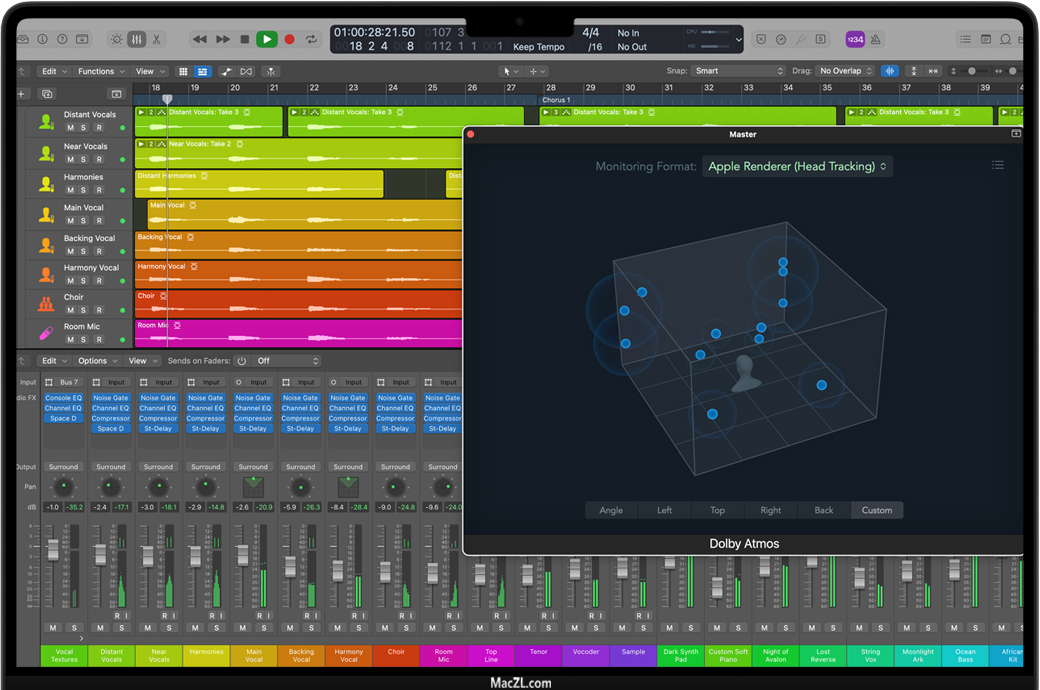 欢迎进入声音的全新维度。杜比全景声工具现已整合到位,让超越立体声境界,创建身临其境的空间音频混音效果,变得轻而易举。你可以为音乐添加生动的三维空间体验,并导出兼容Apple Music的杜比全景声文件。无论你身处配备杜比全景声多扬声器系统的录音棚,还是使用笔记本电脑通过AirPods Max对环绕声混音进行双声道监听。Logic Pro能适应各种情况下的空间音频创作流程。