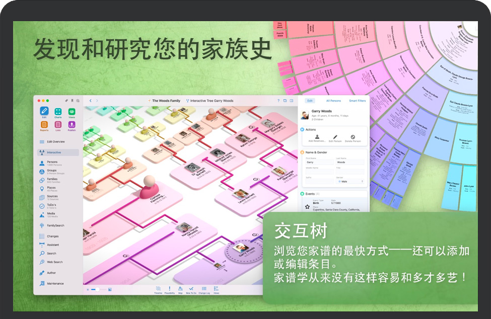 MacFamilyTree 10 for Mac 是一款快速、可靠、流畅的家族族谱制作软件,专为Mac量身定制。MacFamilyTree 专为macOS开发,利用Apple最新操作系统的先进而强大的核心技术。得益于最新的 Apple 技术,尽管有许多动画和交互元素,界面仍然感觉非常流畅。交互式家族树、虚拟树或虚拟地球仪的令人印象深刻的展示只有通过使用 Mac 平台所提供的一切才能实现。几代编年史家梦寐以求的家谱!