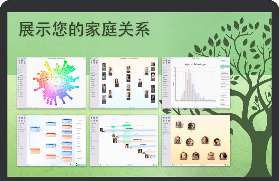 现代型家谱研究和发布FamilySearch:数十亿个家谱条目 Web研究:直接从应用程序内部搜索流行的家谱门户 MacFamilyTree.com:创建网站 家谱书籍:完美的礼物 GEDCOM 导入和导出:与其他应用程序交换信息 以多种格式导出图表和报告 广泛的报告和列表 个人、家庭和亲属报告
