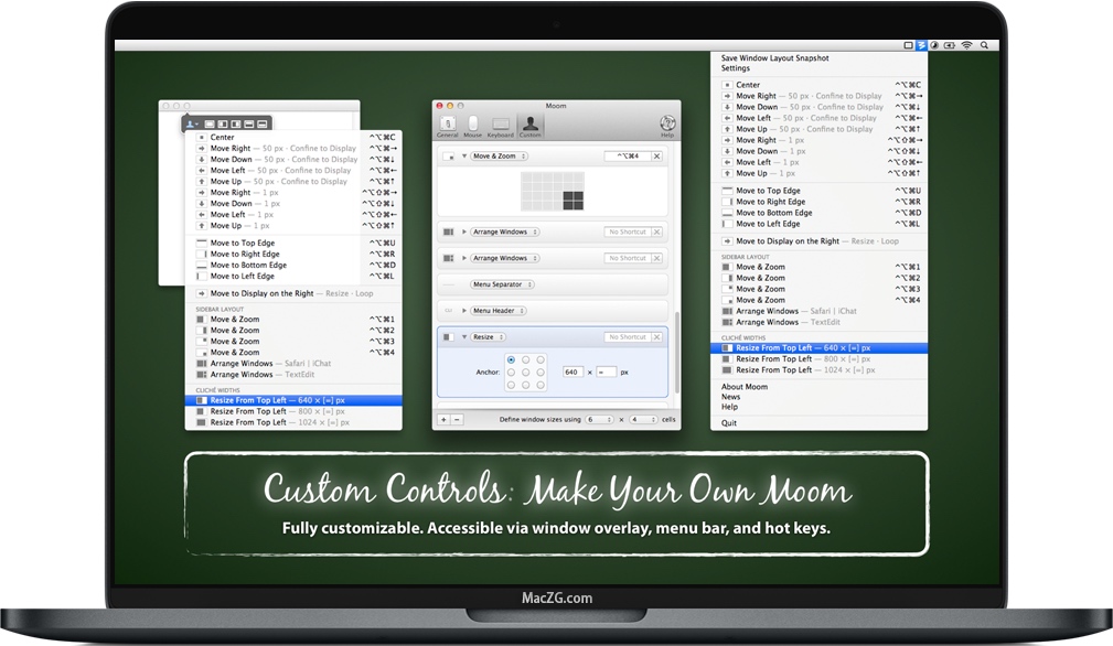 通过Moom菜单栏图标,绿色按钮的弹出调色板或键盘快捷键访问自定义命令。