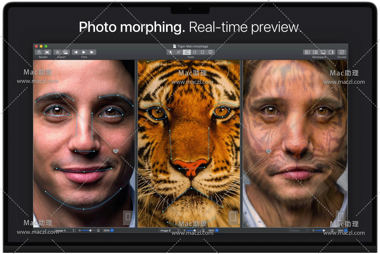 Morph Age for Mac 是一款macOS上创建变形和扭曲动画应用程序。使用“Morph Age”,可以从两个或多个图像创建变形动画。定义每个图像中匹配特征的曲线(例如,在面部变形的情况下,眼睛、鼻子、嘴巴的轮廓),并实时预览更改。如果对结果满意,可以将变形导出为电影或多个图像。可能性几乎是无限的!变形人脸,动物,人对动物,物体…