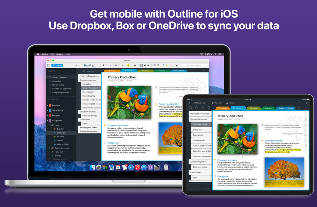 Outline是用于macOS的直观笔记应用程序,具有类似于真实纸质书的便捷结构:笔记本,小节,小节和页面组可帮助保持笔记的顺序,而不管其复杂性如何。 Outline非常适合学生,教师,医师,律师,执行官以及日常生活中涉及各种笔记的每个人。它可以与iPad版Outline和Microsoft OneNote,使笔记成为多平台。 享受笔记在页面上的任何地方键入。就像在一个好的旧纸质笔记本中一样,您可以按自己的方式进行操作,而无需使用任何工具!限制已成过去:随着想法的增长,在画布中填充您的想法,无论它们位于何处。 整理数据Outline的完美组织直观地描绘了您的想法的层次结构。在笔记本中创建页面,部分和部分组,并根据特定主题对其进行自定义。您不会迷路,但对这种结构的简单性感到满意。 使您的笔记很棒使用各种格式:更改字体大小和颜色,应用样式和突出显示,创建编号和项目符号列表,表格和超链接。使用相关图标可视化您的笔记-添加标签,创建待办事项列表,不要错过任何东西。 附加文件并插入打印输出要在一个地方收集相关文档,请将它们添加为文件附件。PDF文件可以作为注释的打印输出插入。这样,Outline成为用于存储和处理数据的通用工具。 保护您的笔记敏感数据值得特别注意和安全。您可以选择在本地或您喜欢的云中使用Outline存储数据的位置。部分密码保护将使用行业标准的加密算法来确保您的信息安全。您可以精确控制何时自动锁定受保护的部分。 使用iPad版Outline进行移动通过这款精美而强大的iPad应用程序获得桌面级体验。您会在较小的外形尺寸中找到相同的功能。不要忘记尝试墨水! 与Microsoft OneNote一起使用大纲可用于iPad或Mac上的本地OneNote文件。您还可以与OneDrive或Sharepoint同步,以与使用OneNote的同事进行笔记协作。