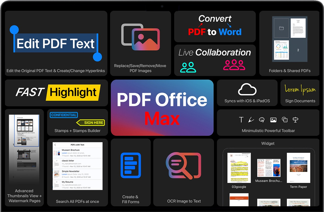 PDF Office Max for Mac 是一款一体式PDF编辑、阅读、填写表单、签名、注释、转换、压缩、协作、OCR图像到文本扫描仪,保护等等!使用PDF Office Max,您可以编辑PDF文本、编辑PDF图像、使用Apple Pencil在PDF文档上绘制(不需要绘制)、将图像转换为文本、邀请人们进行实时协作编辑、填写PDF表单、签署PDF文档、编辑超链接和在iCloud上上传无限PDF,以及从任何iOS和Mac设备访问数据。