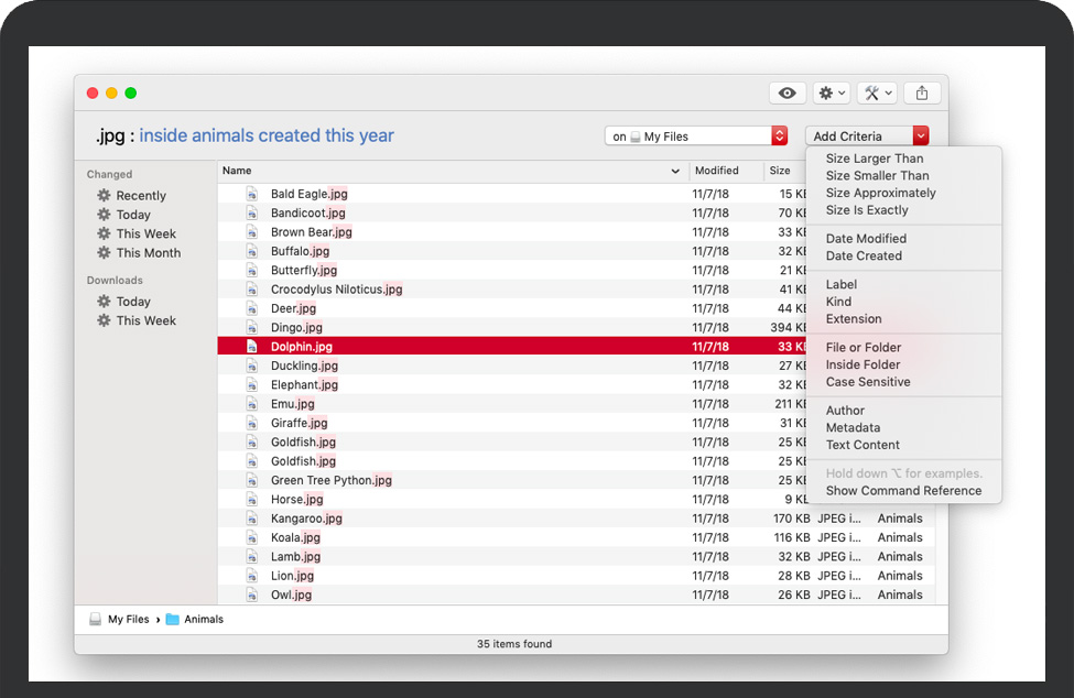 | ProFind支持创新的自然语言查询、应用程序启动、空间磁盘浏览、隐藏位置搜索、Finder 集成、搜索保存、历史记录、脚本等,它是您唯一需要的搜索应用程序。 |