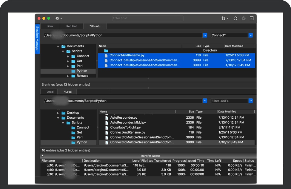 SecureFX 在单个客户端中支持 SSH2、SFTP、FTPS (FTP/TLS)、HTTPS(WebDAV 和 S3)、SCP 和传统 FTP,在连接到一系列远程服务器时提供最大的灵活性。