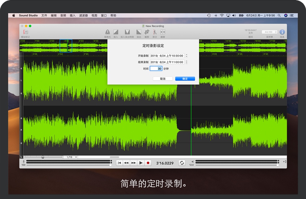 Sound Studio 是一款简单易用的苹果机应用程序,可用于在计算机上录制、编辑和制作数字音频。Sound Studio 可用于实现磁带和黑胶唱片的数字化,为现场演出录音,使用淡入淡出功能制作您自己的混音,调整音量及平衡,添加数字化效果以及用各种主流文件格式保存音频。!