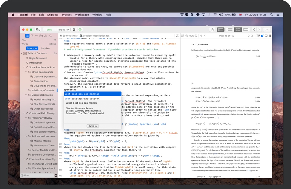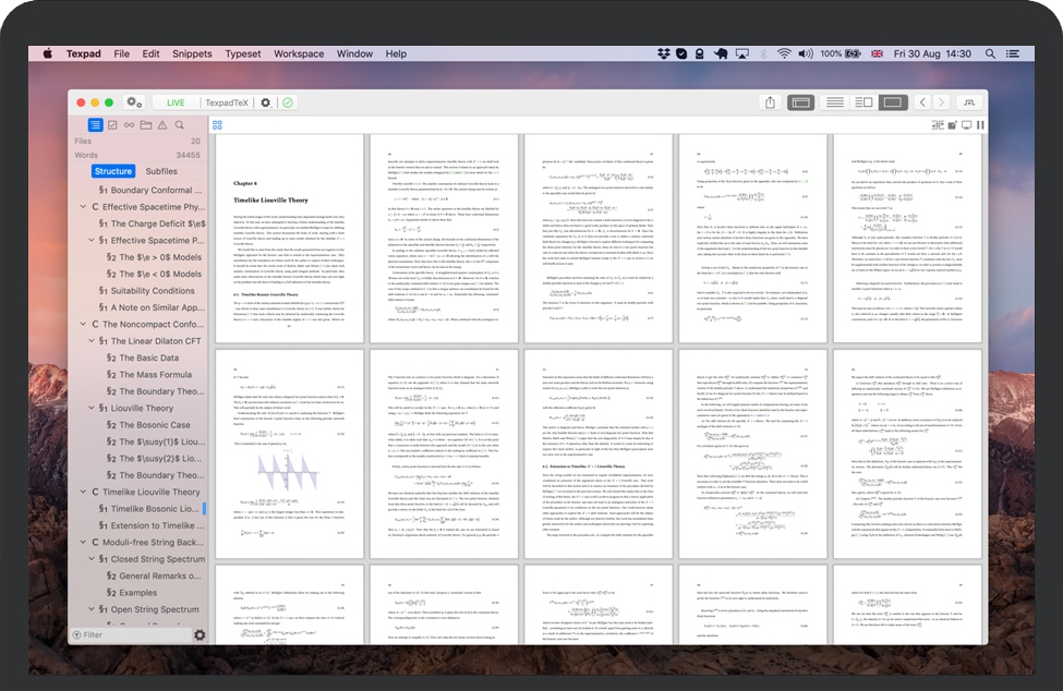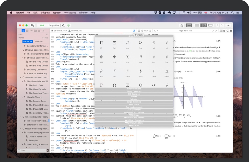 Texpad for mac 是一款LaTeX编辑器。当使用 Texpad 打开文档时,它会对其进行扫描,查找LaTeX结构命令和所有包含的文件,然后为您提供一个大纲视图,您可以使用该视图快速浏览整个项目。