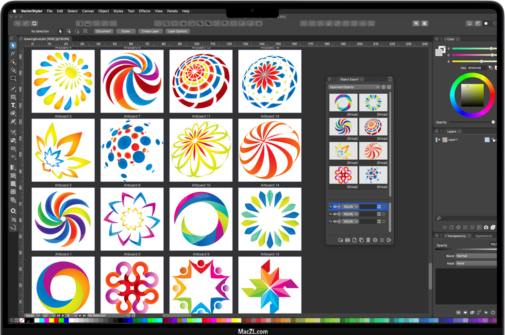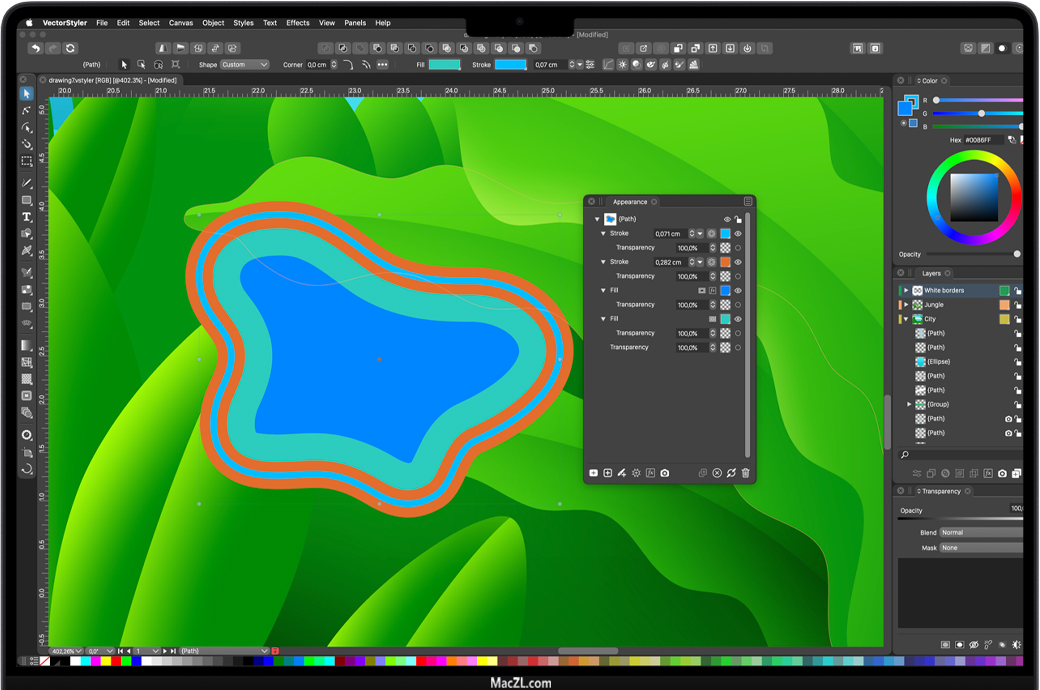 VectorStyler for Mac 是一款先进的插图和矢量图形软件,具有大型新功能集和工作流改进。VectorStyler的开发目标是提供设计师和插图画家熟悉的所有功能,同时引入新的创新功能。为屏幕、印刷品和网页创建插图、徽标、图标、绘图、版式、矢量艺术。在任何形状上放置和编辑文本。路径对齐上的文本可以链接到形状,以便随着形状的更改而动态更新。使用节点工具将点文本的基线拖动到曲线中。路径上的文本可以使用弯曲效果来实现平滑的字形扭曲。