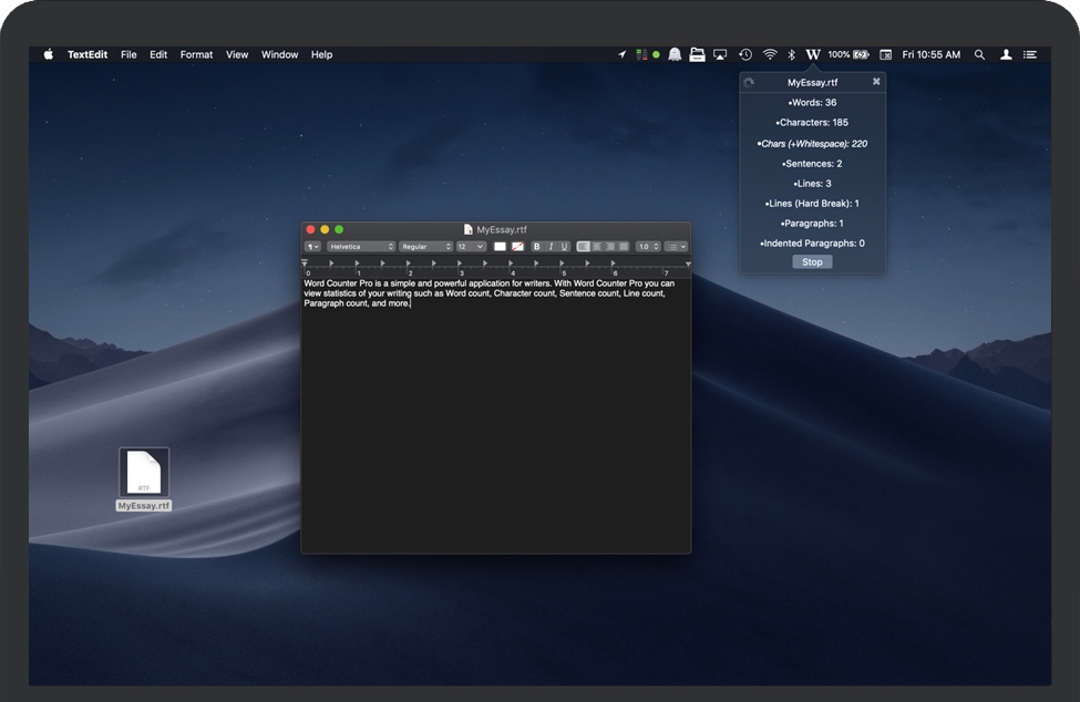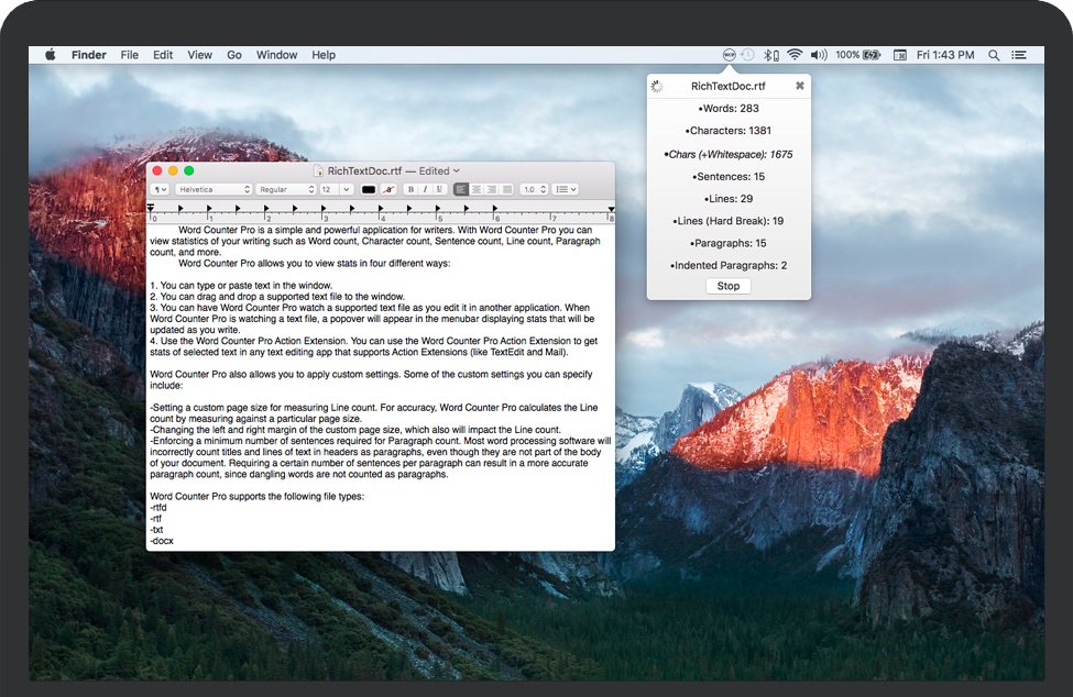 3.让Word Counter Pro在另一个应用程序中对其进行编辑时观看受支持的文本文件。当Word Counter Pro观看文本文件时,菜单栏中将显示一个弹出窗口,其中显示的统计信息将在您编写时更新。