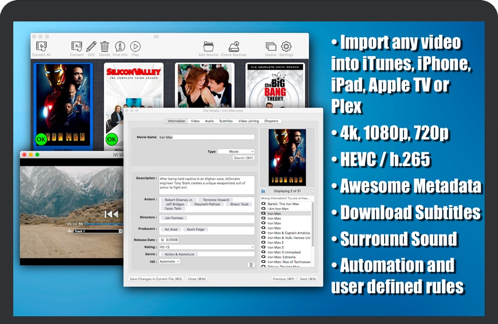 •iVI允许您使用信息(元数据)更新您现有的视频文件,例如节目描述、演员列表、海报艺术,所有这些都可以在 iTunes 中或从桌面显示,而无需重新转换