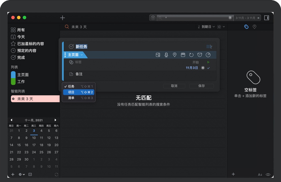 •与快速查看在Finder或其他内置macOS应用程序中的工作方式相同。使用空格键放大和缩小任务以预览附于任务的注释、多行标题或其他详细信息。