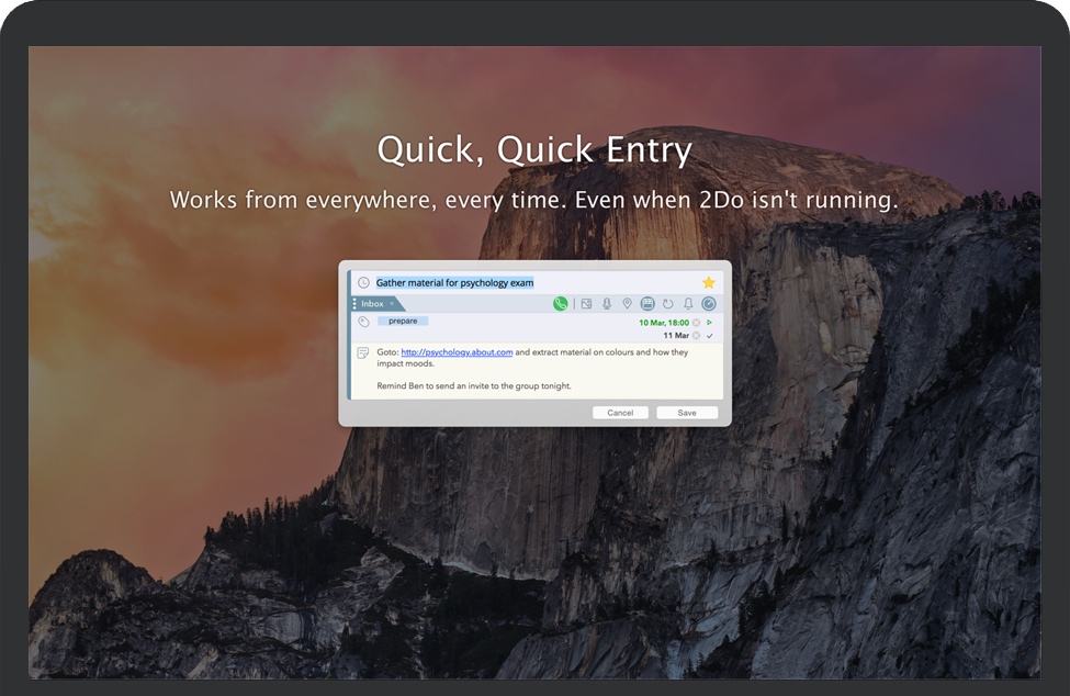 •保存您的想法。使用全局热键,Quick Entry 允许您从任何应用程序或任何空间添加任务。