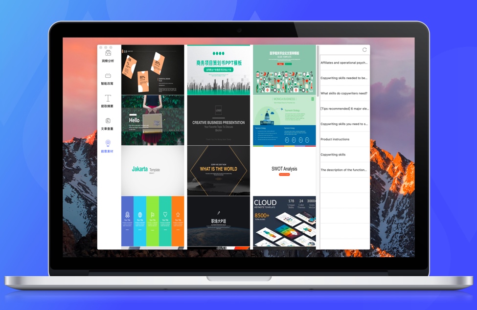 AICopy for Mac 中文名:探狐文案;是一款专业的文本改写和论文查重应用程序。无论您是在Office办公、幻灯片策划、自媒体文章、电子邮件、写作、毕业论文还是社交媒体帖子,都能让你提升效果和效率。借助自动化创意工具,您可以在几秒钟内生成营销文案。改写功能能帮助您写得更好、更快、更清晰。