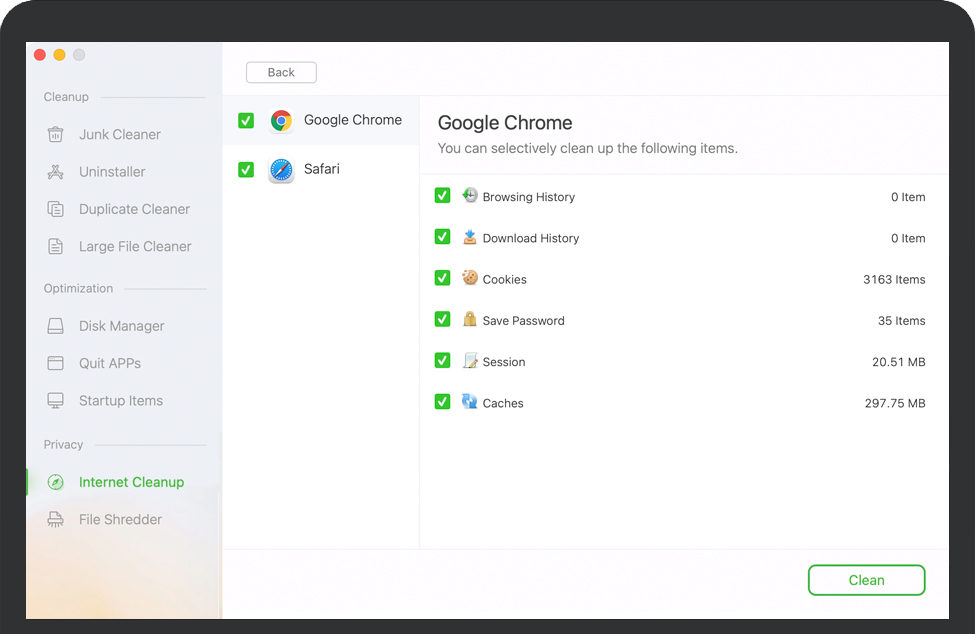 ![]() 内存优化器一键退出所有应用程序和进程以释放内存。 | ![]() 启动管理器管理启动项以提高Mac的启动速度。 | ![]() 互联网清理快速删除您的浏览历史记录以及在线和离线活动痕迹。 | ![]() 文件粉碎机永久粉碎Mac上的敏感文件/文件夹以防止数据恢复。 |