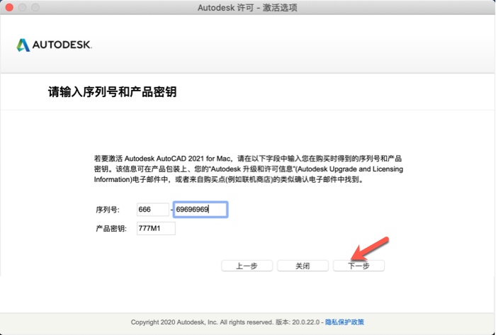 然后把注册机上的激活码复制到软件的注册激活框里,点击“下一步”按钮(这里复制和粘贴都只能用鼠标右键操作)。