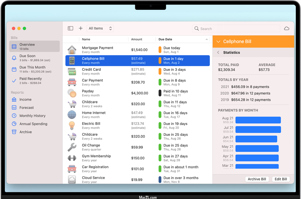 Chronicle for Mac 绝对是一款你会羡慕的漂亮的个人理财应用。使用Chronicle追踪和支付账单,管理您的个人财务,Chronicle是Mac上最简单的账单规划工具。收到通知,不要错过下次付款的到期日,永远不用为迟到支付额外费用。将所有账单放在一个地方,安排、检查和分析,计划预算。适用于Mac、iPhone、iPad和iPad的通用应用程序。使用Chronicle Cloud同步在所有设备上的Mac上查看账单,如果您愿意,甚至可以与合作伙伴共享账单。