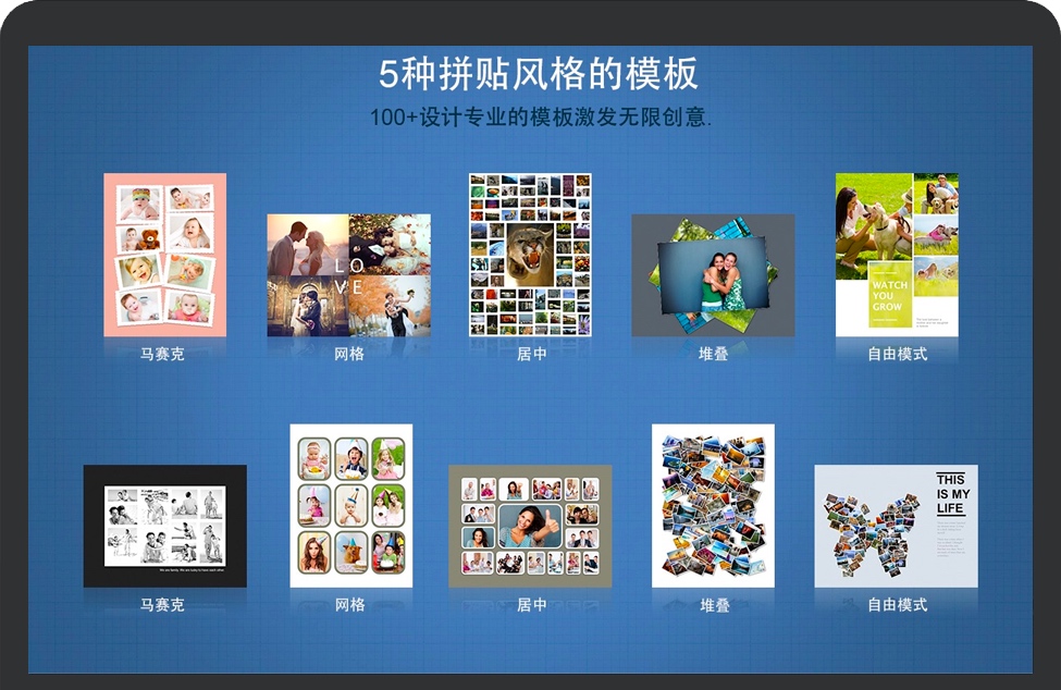 - 支持五种拼贴风格-马赛克,网格,居中,堆叠以及自由模式