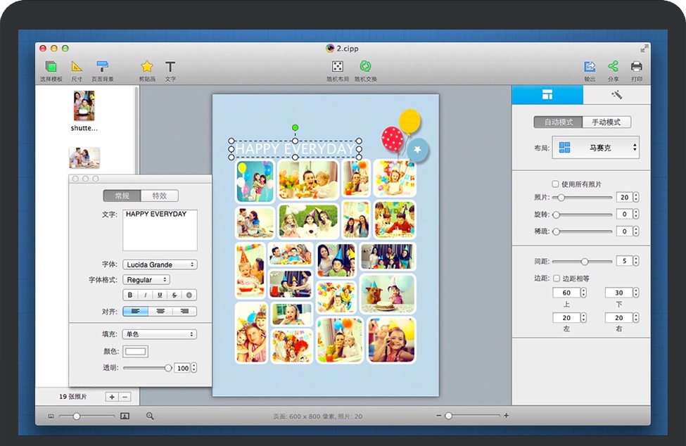 使用拼贴精灵专业版, 制作照片拼贴毫不费力。新增的自由模式拼贴风格以及超过60个全新的模板将会带你给更多的创作可能。你可以直接从iPhoto导入图片,在自动生成照片拼贴时,配备人脸识别功能的拼贴精灵将智能地为你适配所有图片。比以往更好的是,你可以应用新增的剪贴画,相框,遮罩等资源让拼贴获得最佳视觉效果。您的佳作完成之后, 您可以输出拼贴, 打印, 或者通过Facebook, 电子邮件, iMessage, AirDrop, Twitter以及Flickr跟家人和朋友分享。除此之外,CollageIt新版本中其他的改进以及大量漏洞修复也将给你营造一个前所未有的用户体验。