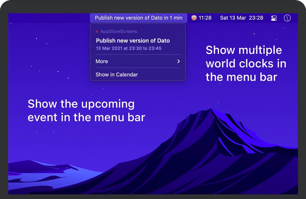 Dato for Mac 在菜单栏中为您提供本地时钟、日期和多个世界时钟。当您单击菜单栏中的 Dato 时,您会看到一个包含日历、日历事件和世界时钟的菜单。所有这些都是高度可定制的。Dato 支持 macOS 支持的菜单栏文本、日期、时间和日历的所有区域设置和语言,但菜单和首选项仅支持英文。Dato仅以英语提供,它将永远不支持农历。