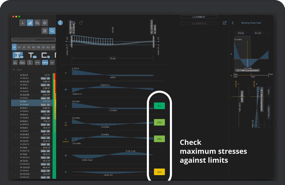 新:检查内部弯曲和剪切应力。将计算应力与梁的强度承载力进行比较。默认情况下,对于韧性金属,这是屈服强度,对于木材,这是最大纤维应力。