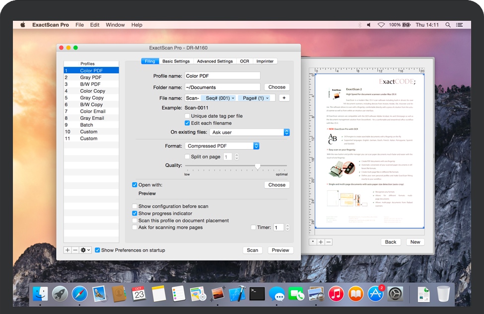 ExactScan Pro for Mac 是一款无纸化办公的专业扫描套装。ExactScan 为来自 Avision、Canon DR 系列、Fujitsu fi 系列、Kodak、Oki、Panasonic、Visioneer 和 Xerox 的专业文档扫描仪提供 400 多种驱动程序,否则这些驱动程序不附带 Mac 驱动程序。此外,它还允许使用带有 TWAIN 或 ImageCapture 驱动程序的任何其他扫描仪。快速扫描、归档、排序、存档和查找文档。