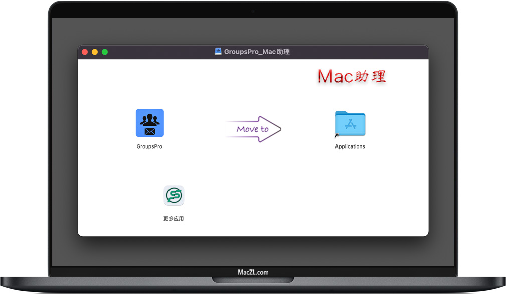 GroupsPro软件安装包下载完成后,打开软件包如上图,请参照 苹果电脑mac拖拽安装软件 进行安装即可。