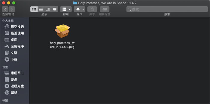 1、软件下载完成后,打开安装包如上图,双击“holy_potatoes__were_in_1.1.4.2.pkg”进行安装。如下图,安装位置选择“应用程序”,继续默认安装。