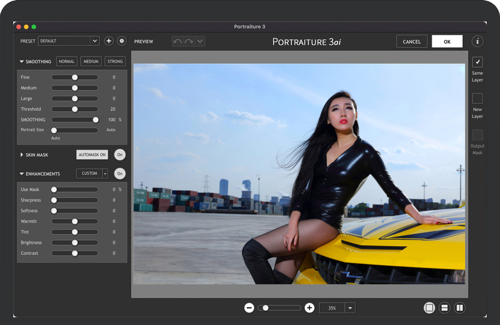 Portraiture 是一款Photoshop插件,免去了选择屏蔽和逐像素处理繁琐的手工劳动,以帮助您实现卓越的人像润色处理。它智能化地平滑并移除缺陷,同时保持皮肤的质地和其它重要的肖像细节如头发,眉毛,睫毛等
