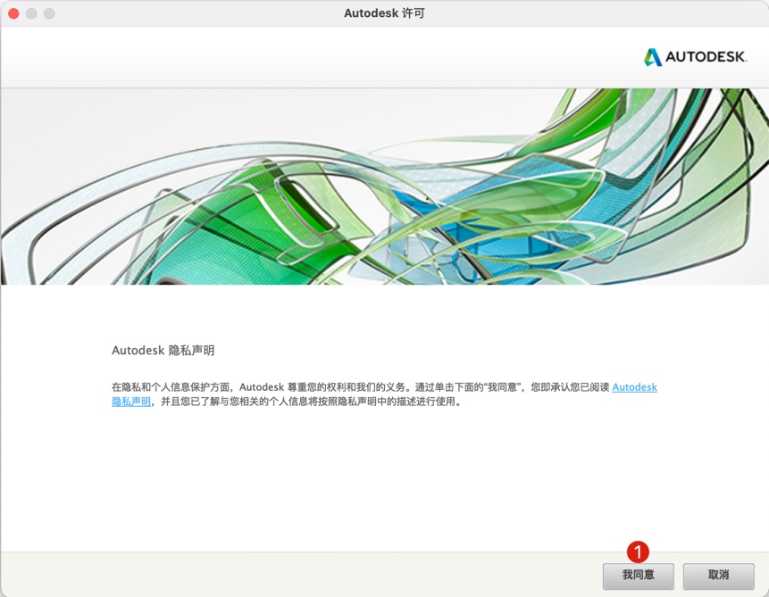 弹出一个软件协议,点击“我同意”,如果你之前安装过或者打开过CAD软件将不会弹出此协议,不要在意,不弹出的话就继续下面的操作即可,如下图。