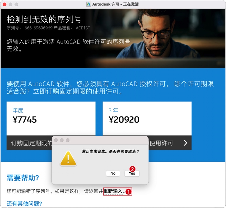 随后出现 无效的序列号 提示,如下图,我们点击下面的“重新输入”。然后再弹出是否取消的窗口,点击“Yes”按钮,如下图。