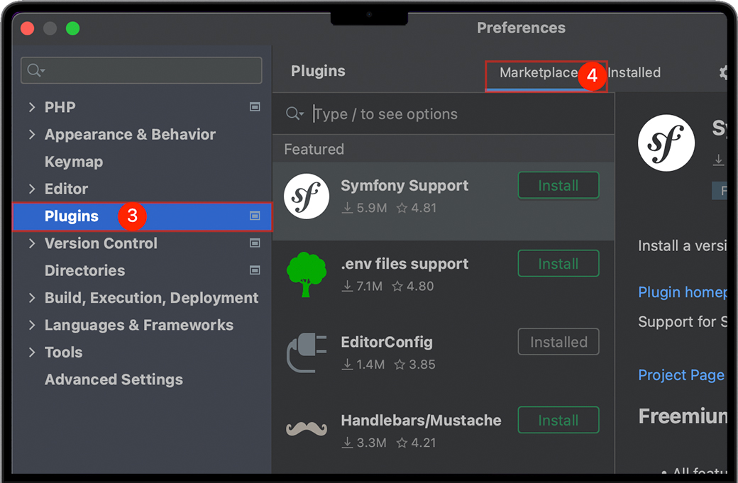 弹出Preferences窗口后,如下图选择Plugins”选项,继续点击“Marketplace”标签。