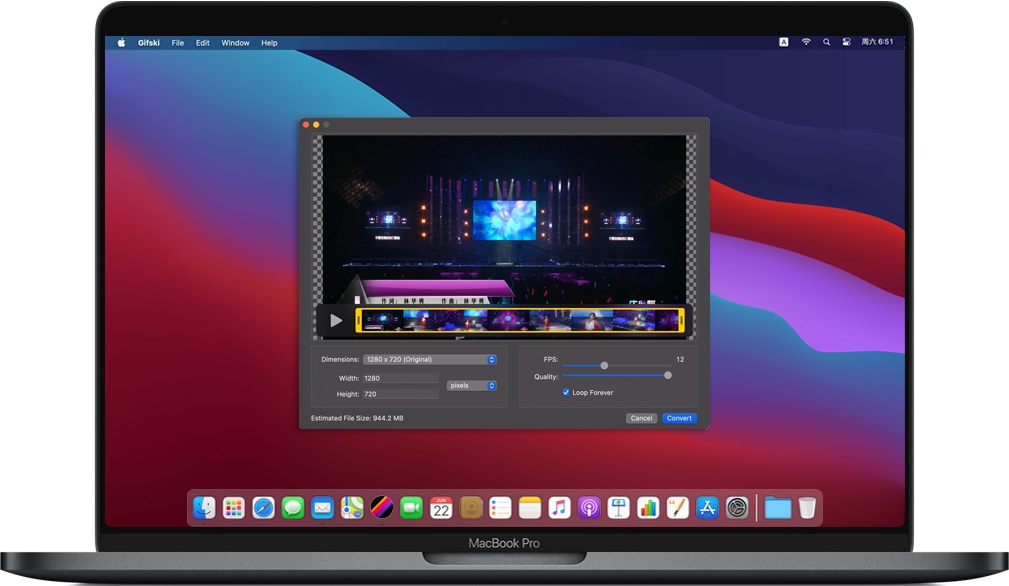 Mac Gifski将视频转换为每帧使用数千种颜色的GIF动画。某些新颖的功能使高效的跨帧调色板和时间抖动成为可能。