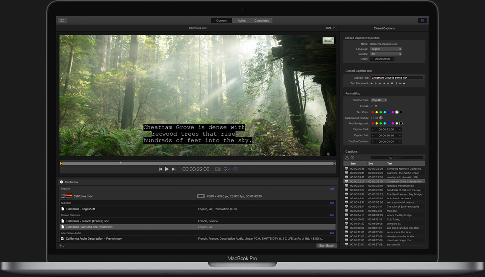 轻松查看、调整和导出隐藏式字幕,并能将多种语言的字幕文件导入一个批处理或 iTunes Store 项目包。