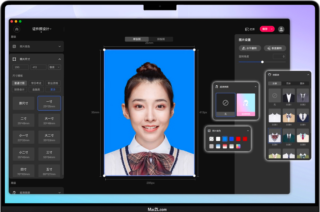 证件照设计【一键抠图】发丝级抠图,精准识别人像部分 【换背景底色】一键智能更换背景底色 【改尺寸】预设超多尺寸,涵盖普通一寸、学历考试等,点击即可修改! 【换服装】提供男、女、童装等超多服装素材,一键换装! 【自动排版】任选尺寸,自动生成排版照,更有辅助线,打印出来很好剪! 【超清美颜】一键美颜,轻松生成最美证件照
