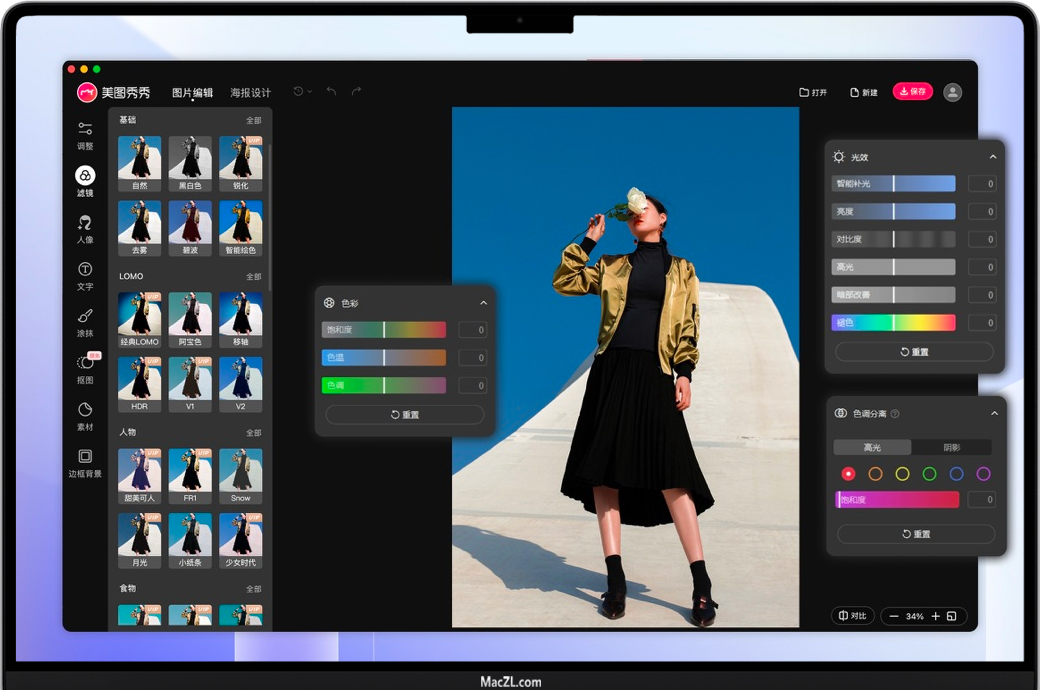 美图秀秀 for Mac 是一款图片编辑与办公设计工具,是海报模板、智能抠图、人像美容、拼图等专业功能,简单好上手!生活办公都能用的美图秀秀,功能专业,操作简单,设计小白、专业设计师皆可快速出图。多场景修图设计,可处理生活/工作照片,制作电商/微商产品图、营销带货宣传海报;自媒体社交平台配图、封面、拼图晒照;企业节假日通知/招聘求职/通知公告/喜报晒单;考试证件照等多场景图片和海报。