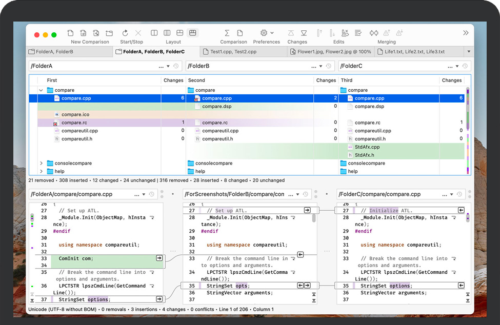 Araxis Merge Pro for Mac 是一款支持两路和三路可视文件比较/合并和文件夹同步应用程序。使用它来比较、理解和组合不同版本的源代码、网页和其他文本文件,甚至是从另一个应用程序(例如,Pages或Microsoft Word)复制和粘贴的文本。Araxis Merge与Time Machine集成,因此您可以比较旧版本的文件。