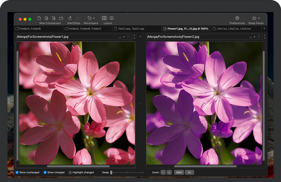 Merge 不仅仅比较文本文件。使用图像比较来比较许多不同类型的图像文件,并立即查看哪些像素已被修改。二进制比较使您能够在字节级别识别数据文件中的差异。