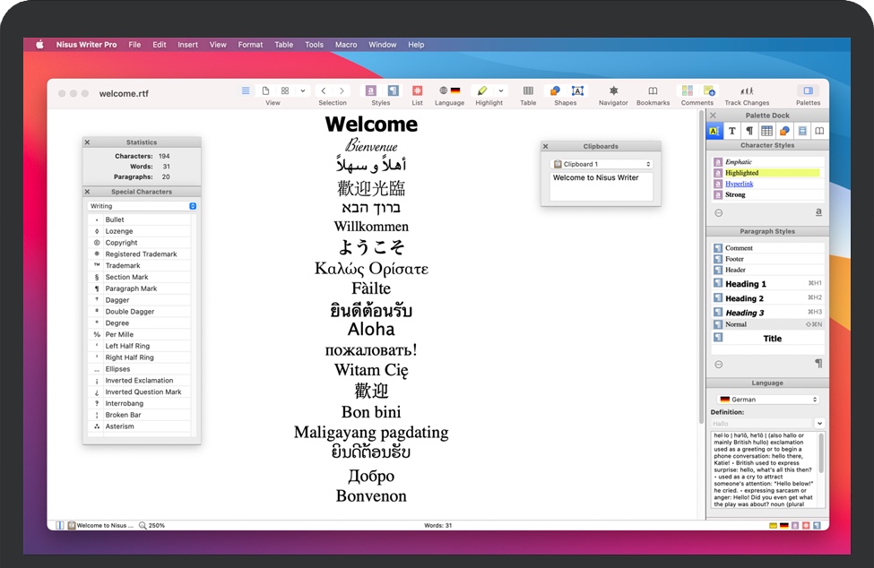 Nisus Writer 从头开始专为 Mac 打造,原生支持以下功能: