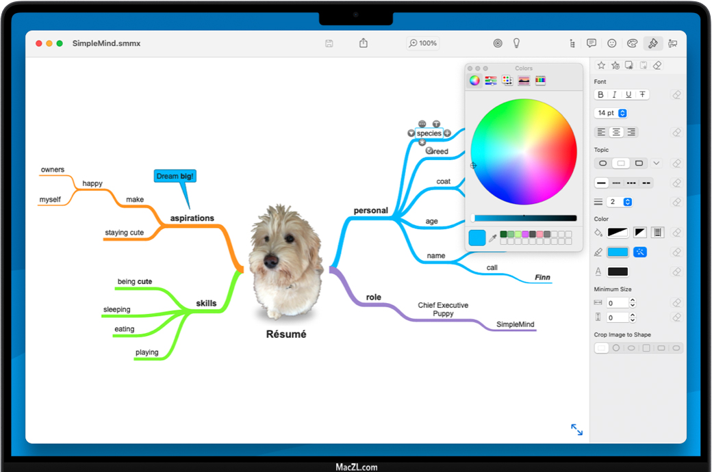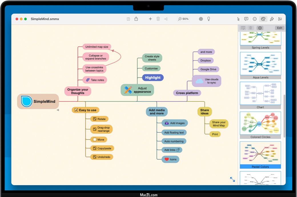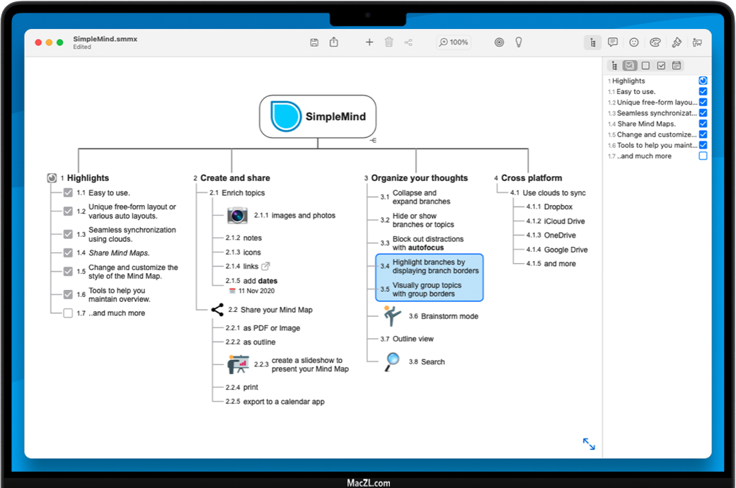 SimpleMind Pro for Mac 是一款轻量的思维导图软件,可将您的Mac变成头脑风暴,创意收集和思维结构设备。思维导图可帮助您整理想法、记忆事物并形成新的创意。SimpleMind Pro界面漂亮而直观,可供您随时随地使用。SimpleMind Pro for Mac功能很强大,贴图、表情、注释、结构、幻灯片模式应有尽有。